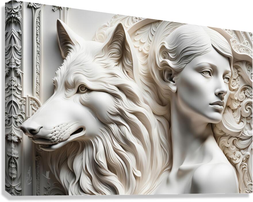 Woman with wolf  decorative relief sculpture  3d wall art print by Nazan Saatci Art  HD Metal print with Floating Frame on Back