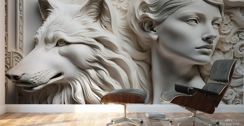 Woman with wolf  decorative relief sculpture  3d wall art print by Nazan Saatci Art Wood print