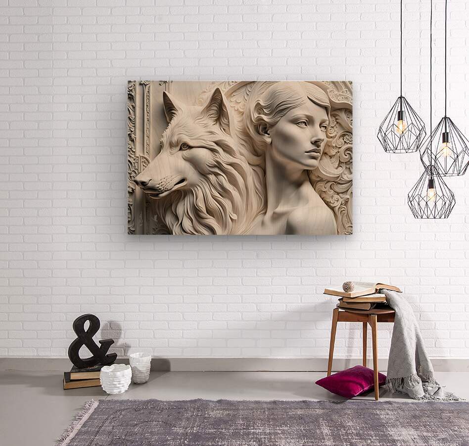 Woman with wolf  decorative relief sculpture  3d wall art print by Nazan Saatci Art  Wood print